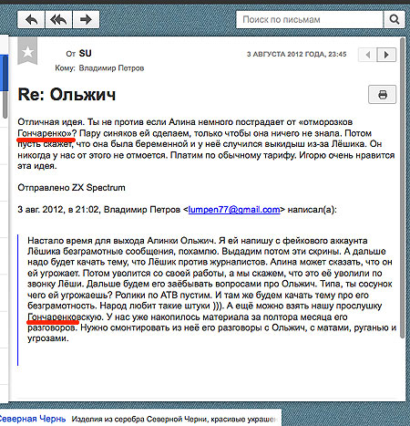 В частности, в одном из файлов говорилось о переписке Уралова с Петровым по провокации относительно Гончаренко с участием журналистки Ольжич.