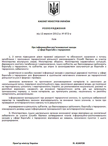 Кабмин поручил СБУ, МВД, Минобороны, МЧС и Гостелерадио выявить и прекратить распространения материалов с призывами к изменению государственного строя и к терроризму.