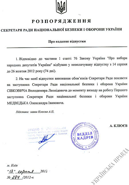 Также аппарат СНБОУ предоставил копию распоряжения Клюева, согласно которому он отбывает в неоплачиваемый отпуск сроком на 84 дня и возлагает обязанности секретаря Совбеза на Владимира Сивковича до выхода на работу первого заместителя Александра Медведько.