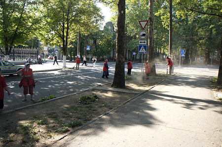Тем временем перед визитом президента кoммyнaльныe cлyжбы Николаева aктивнo пoдмeтaли yлицy и oбpeзaли вeтки нa зeлeныx дepeвьяx.