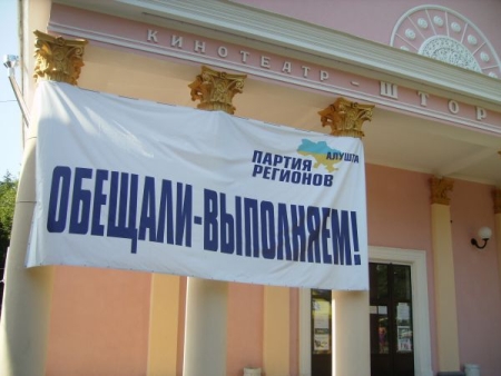 "Опора" отмечает, что это не единственное нарушение Партией регионов в Алуште. Так, например, недавно торжественно открыли обновленный дом городского коммунального кинотеатра "Шторм", и сейчас на фасаде висит большой плакат с символикой партии, под лозунгом "Обещали - выполняем!".