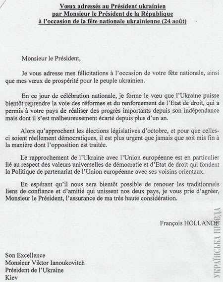 Президент Франции Франсуа Олланд в критической форме поздравил Виктора Януковича с недавним днем независимости Украины.