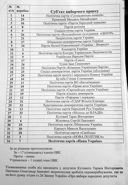 Об этом заявил "Украинской правде" кандидат по этому округу от партии "УДАР" Тарас Кутовой, доверенному лицу которого удалось сфотографировать жребии.
