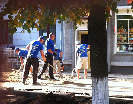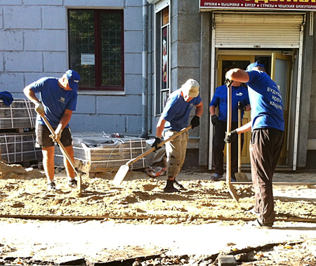 В Сумской области рабочие клали брусчатку в одежде с рекламой ПР