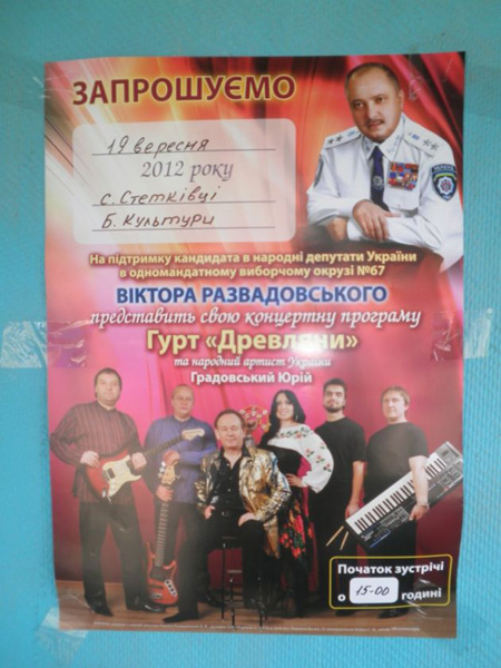 "Кандидат в народные депутаты Развадовский запланировал проведение концертов эстрадных певцов в своем округе ... В графике проведения концертов - 24 выступления группы "Древляне", которым руководит и является солистом действующий начальник управления культуры Житомирской ОГА Юрий Градовский", - говорится в сообщении .