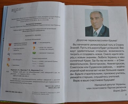 Депутат от Партии регионов, кандидат-мажоритарщик Борис Дейч раздавал буквари крымским первоклассникам.
