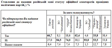 Абсолютное большинство избирателей ВО "Свобода" (94%), ВО "Батькивщина" (85%), УДАРа (74,0%) и подавляющее большинство избирателей "Украина – вперед" (53%) – против предоставления русскому языку статуса официального языка, а подавляющее большинство избирателей Партии регионов (67%) и Компартии (62%) – за предоставление русскому языку статуса официального в Украине.