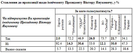 Идею импичмента президенту Виктору Януковичу больше поддерживают избиратели ВО "Батькивщина" (72%), ВО "Свобода" (74%), а также подавляющее большинство УДАРа (47%, а 31% – не поддерживают).