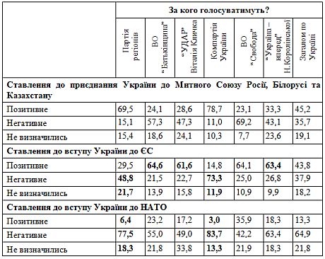 Пророссийская, антиевропейская и антинатовская ориентация преобладает у избирателей Партии регионов и Компартии: среди сторонников ПР 69% – за присоединения к Таможенному Союзу России, Беларуси и Казахстана, 49% - против вступления в ЕС, 77% - против вступления в НАТО, а среди избирателей КПУ 79% – за присоединение к ТС, 73% – против вступления в ЕС, 84% – против вступления в НАТО.