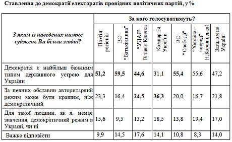 При этом в электорате всех ведущих партий, кроме КПУ, преобладают сторонники демократии (от 60% – в ВО "Батькивщина" до 45% – в УДАРе Виталия Кличко).