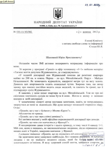 Журавский отмечает, что в программе "Гроші" на 1 +1 вышел материал "Тайная жизнь депутата Журавсього", где утверждалось, что он является владельцем двух роскошных квартир, одна из которых находится на Михайловской улице. В сюжете говорится, что Журавский водит туда моделей.