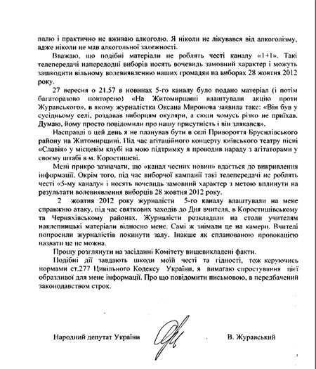 Возмущение депутата вызвал также сюжет на 5 канале "На Житомирщине устроили акцию против Журавского". По его словам, журналистка утверждала, что он в соседнем селе раздавал избирателям очки, и поэтому сюда не приехал, в то время, как он проводил плановое совещание в своем штабе в городе Коростышеве.