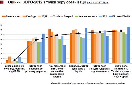 Вместе с тем почти столько же - 75% - согласны, что проведение Евро-2012 было слишком "дорогим удовольствием" для страны. Этот тезис также почти одинаково поддержали как жители запада, так и востока, более всего – сторонники "Батькивщины" и Компартии.