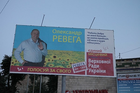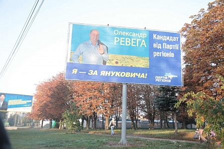 "Чтобы защитить любимую Партию регионов от произвола неконтролируемого кандидата в народные депутаты, мы в конце сентября за свой счет изготовили плакаты с символикой Партии регионов и наклеили на борды Ревеги".