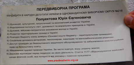 "В воскресенье, 7 октября, на территории прихода парафии княгини Ольги, которая находится на улице Вербицкого в Киеве, церковнослужители по окончании утренней службы вручали прихожанам агитационные материалы с призывом голосовать на будущих выборах в Верховную Раду за Юрия Полуектова, который идет на выборы по мажоритарному округу № 216 в Дарницком районе", - рассказала киевлянка Виктория.