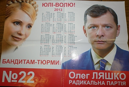 Кандидат в депутаты по избирательному округу №208 Олег Ляшко использует в своей агитации фото лидера партии "Батькивщина" Юлии Тимошенко.