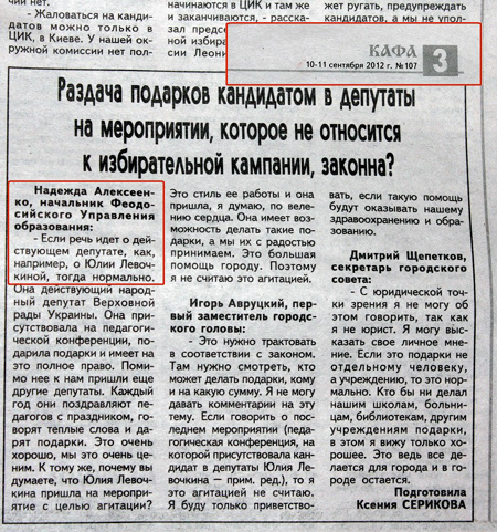 Начальник Феодосийского управления образования Надежда Алексеенко не считает подарки накануне выборов от Юлии Левочкиной подкупом избирателей.