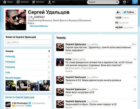 Между тем сам Удальцов на своем Twitter также сообщил, что его арестовали.