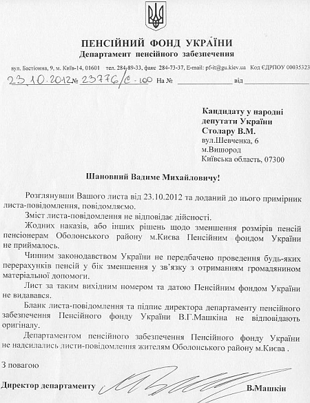 Ранее сообщалось, что многим жителям Оболонского района начали приходить письма адресатом, которых значится Пенсионный Фонд. Под каждым таким письмом стоит подпись директора департамента пенсионного обеспечения Машкина Владислава Геннадиевича.