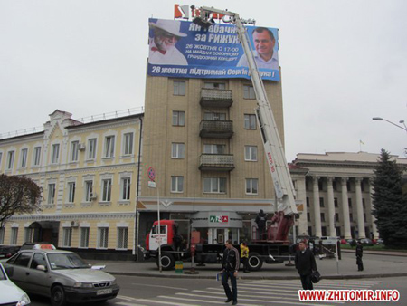 25 октября на площади Соборной в Житомире сотрудники МЧС с помощью спецавтомобиля с пожарной лестницей развешивали агитационный плакат за кандидата Сергея Рыжука.