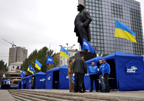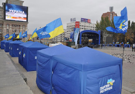 На площади Ленина в центре Донецка разбили палаточный городок в связи с проведением митинга-концерта Партии регионов "От стабильности к благополучию!".