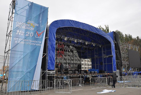 В связи с проведением концерта на площади смонтирована сцена, а по всему периметру расставлены палатки с символикой Партии регионов.