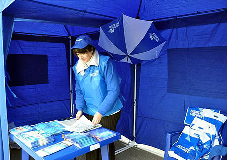 В палатках "бело-голубые" агитаторы всем желающим раздают агитационные материалы с символикой партии: листовки, календари, ручки, флажки, партийную газету.