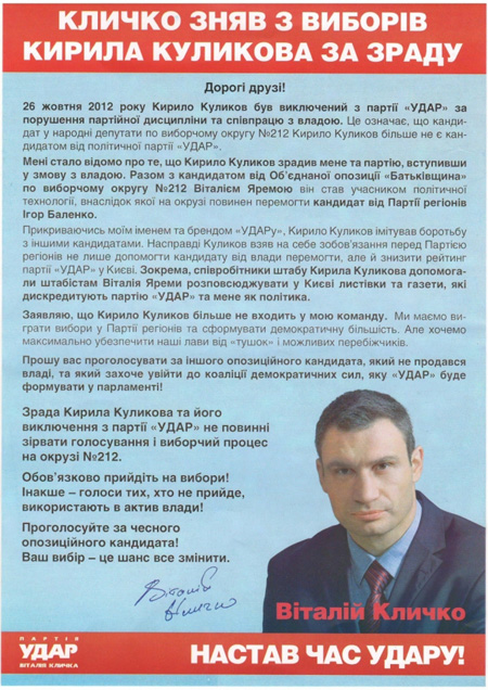 Как сообщает пресс-служба партии, в распространенной листовке содержится ложная информация о том, что "УДАР" якобы отозвал своего кандидата Куликова, которого обвинили в сотрудничестве с партией власти для срыва выборов.