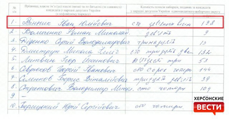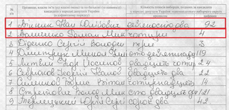 Похожая ситуация и в УИК №650405 - 92 голоса того же Винника заменили на 4 голоса кандидата Воличенко Романа.