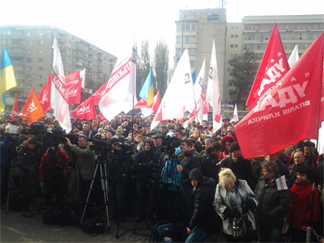 Под ЦИКом находится несколько сотен человек, которые держат флаги "Батькивщины", "УДАР" и флаги Украины.