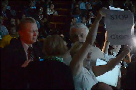 Позднее представитель УГО Олег Герасик, который трижды менял свои утверждения, объяснил, что плакаты у журналистов вырывали, потому что охранники не смогли прочитать надписи на английском языке.