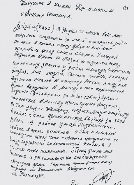 "Сейчас я принял решение о явке с повинной, потому что понял, что совершил преступление по заказу грузинской политической элиты, а я считаю себя патриотом", - говорится в явке.