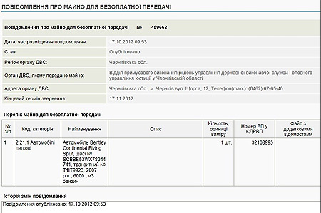 Отдел принудительного исполнения решений Главного управления юстиции в Черниговской области 17 октября получил в безвозмездное пользование автомобиль Bentley Continental Flying Spur 2007 года выпуска.