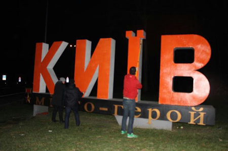 В ночь с 21 на 22 ноября ко Дню Свободы неизвестные перекрасили надпись "Киев - город герой", которая находится со стороны Житомирской трассы, в оранжевый цвет.