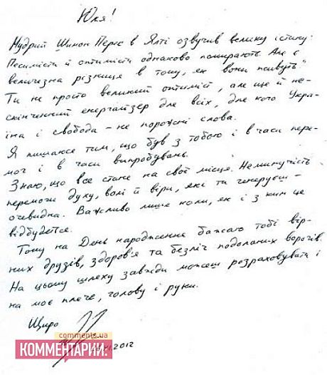 Лидер партии УДАР Виталий Кличко также отправил Тимошенко письмо с поздравлением, в котором пожелал ей "мужества и выдержки", крепкого здоровья и силы.