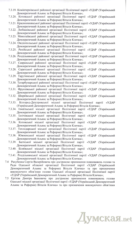 "Все руководство одесской областной, городской, районных и первичных организаций партии "УДАР" освобождается от своих обязанностей без указания причин. Назначены и.о. на эти должности волевым решением партии. Единственное, что мы знаем точно это то, что до 22 ноября 2012 года практически все эти люди членами партии "УДАР" не являлись, заявлений о вступлении в партию в одесскую областную организацию партии не подавали и никакого отношения к партии не имели", - утверждает он.