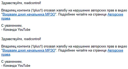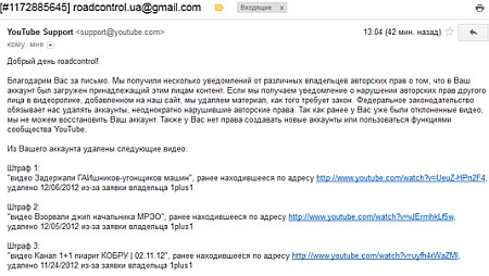 "Дорожный контроль" написал письмо автору жалоб - сотруднику канала "1+1" на электронную почту [email protected] с просьбой отозвать жалобы. "ДК" получил письмо от Google о том, что "1+1" отозвал две свои жалобы. Но, вместе с тем, канал "Дорожного контроля" был все равно закрыт.