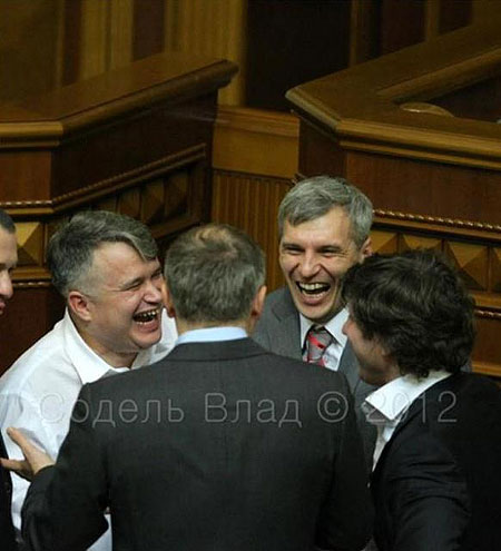 Через полчаса после первой драки в парламенте в четверг "свободовцы" весело что-то обсуждали с "регионалами".