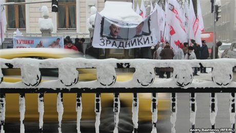 Между тем под Верховной радой около пілусотни активистов ВО "Батькивщина" пикетировали Верховную Раду с плакатами и скандированиями "Тушки - прочь!".