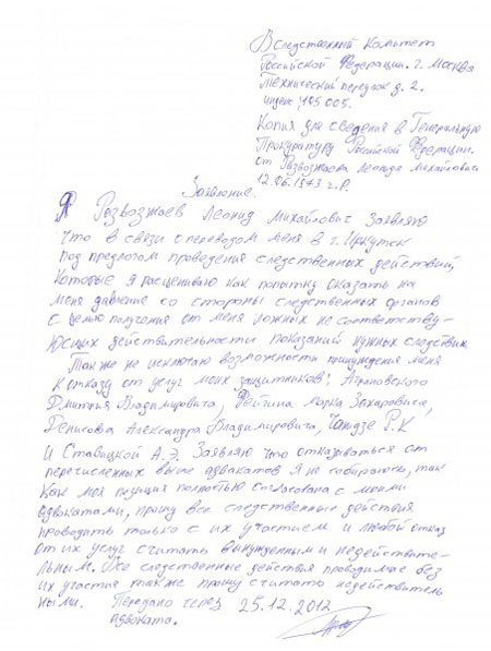 Развозжаев также не исключает возможность принуждения его к отказу от защитников.