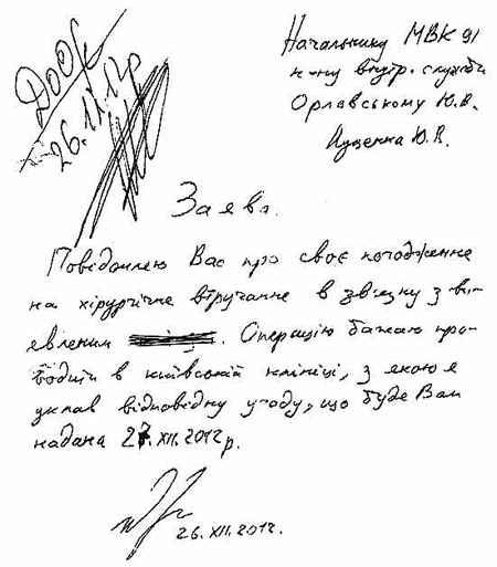 В доказательство своих слов приводим оригинал заявления Луценко, которое последний предоставил руководству колонии (зачеркнуто диагноз).