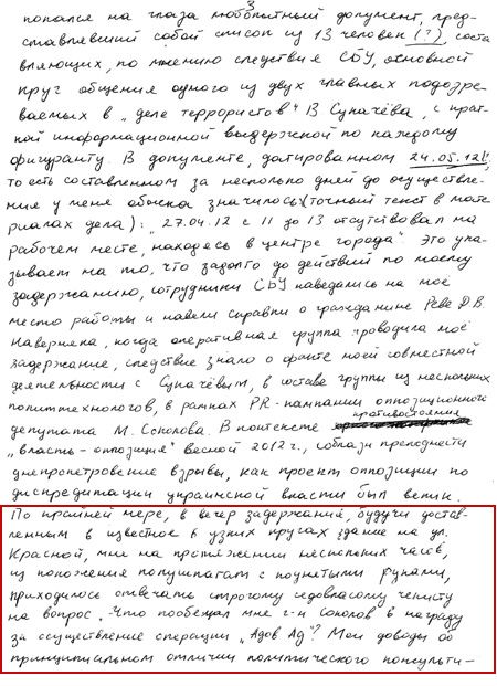 "Ещё до того, как судом было вынесено решение о моём аресте, днепропетровский прокурор Н. Марчук заявила, что задержаны именно те "террористы" и вина их доказана. Другими словами, ошибки быть не может, давайте быстрее открывать шампанское, награждать друг друга званиями и премиями", - сообщил он.