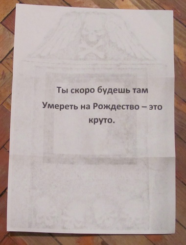 "В ночь с 5 на 6 января я услышала сильный стук в окно, мат и угрозы: "....Убью...!". Регулярные бумажные листовки с угрозами начала получать с 19 декабря 2012 года. За это время домой два раза приходили работники милиции", - отмечает она.