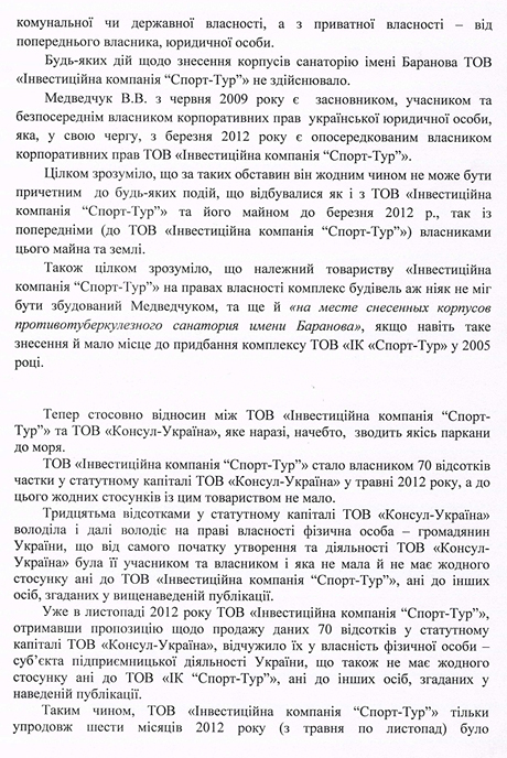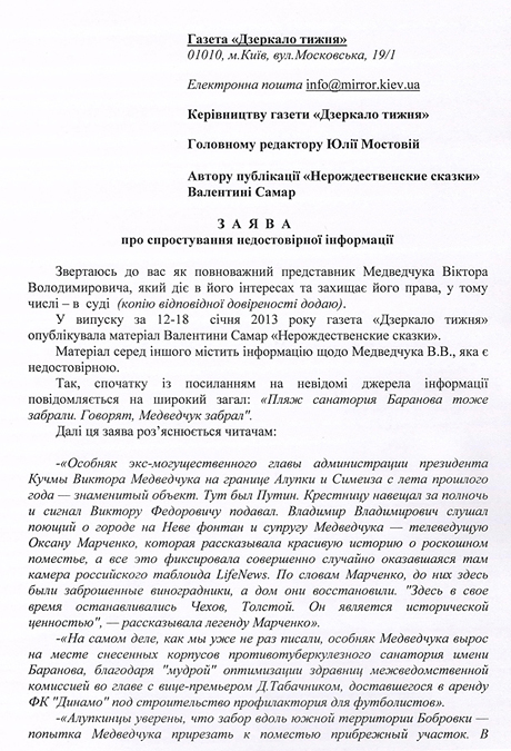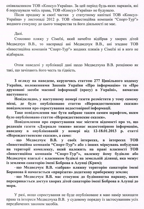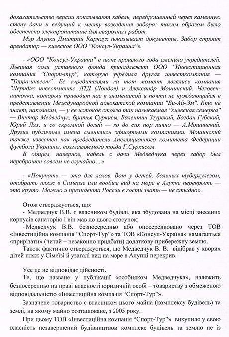 В своем заявлении представитель Медведчука требует от газеты опровержения информации о том, что Медведчук построил на территории комплекса, принадлежащего на праве собственности ООО "Инвестиционная компания "Спорт-Тур", принадлежащее ему здание или Медведчук вообще является владельцем здания на земельном участке, который граничит с землями санатория имени Боброва в Алупке.