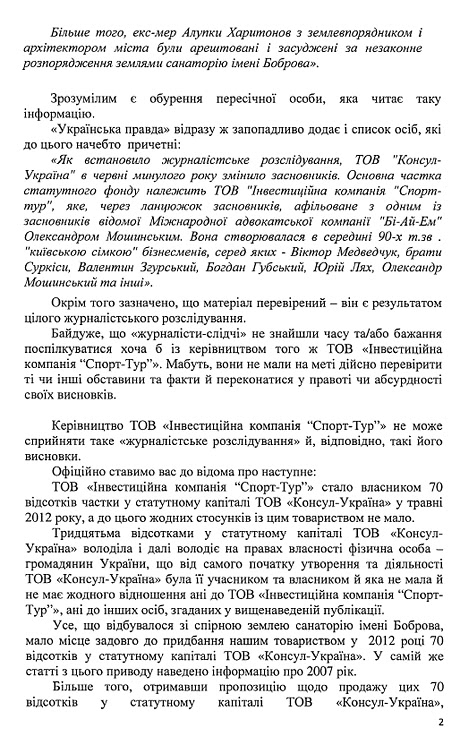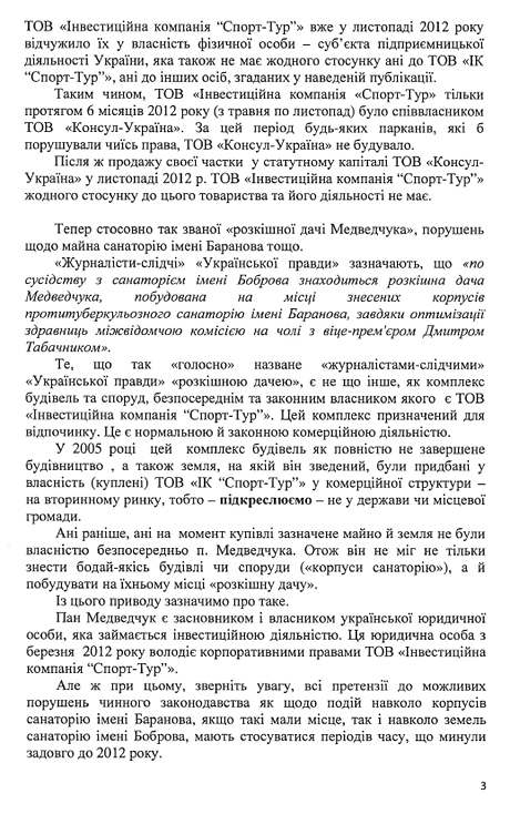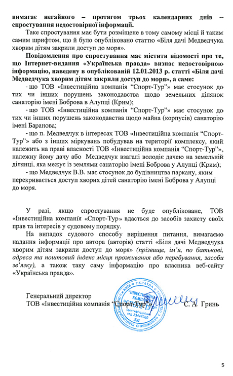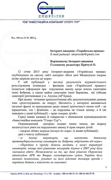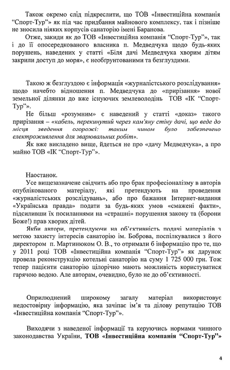 Аналогичные письма поступили от представителя Медведчука и ООО "Инвестиционная компания "Спорт-Тур" в адрес "Украинской правды".