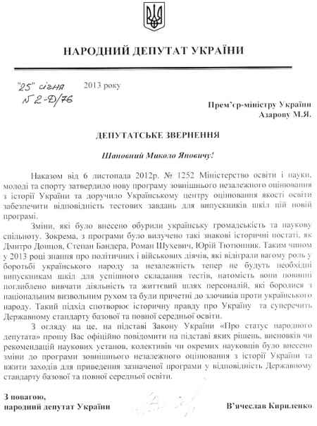 "Учитывая вышеизложенное, прошу уведомить, на основании каких решений, выводов и рекомендаций научных учреждений, коллективов или отдельных ученых были внесены изменения в программу ВНО по истории и принять меры для приведения указанной программы в соответствие Госстандарту базового и полного среднего образования", - подытожил Кириленко.