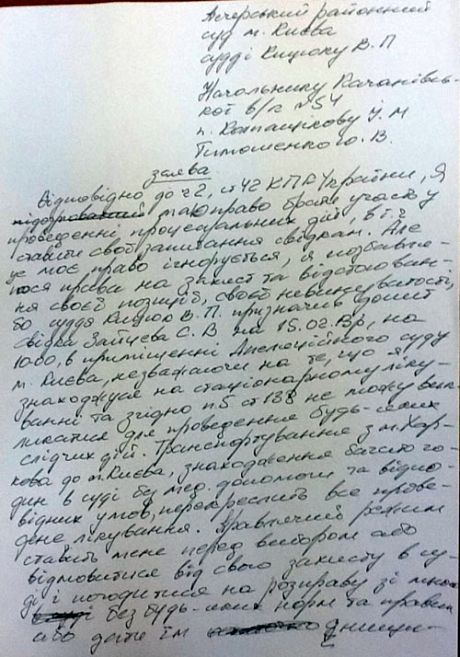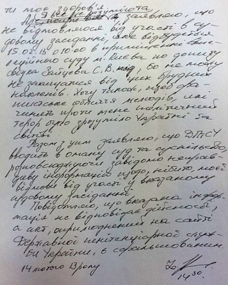 В этом заявлении Тимошенко пишет, что не отказывается от участия в судебном заседании 15 февраля ради своей защиты, но по закону не может вызываться на следственные действия, потому что находится на стационарном лечении, а транспортировка повредит ее здоровью.