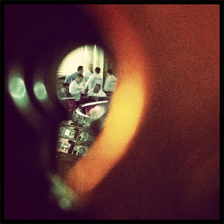 Журналисты могут наблюдать за тем, что происходит в сессионном зале только через замочную скважину. В нее видно, что в зале сидят УДАРовци и депутаты от "Батькивщины" в белых и красных регланах. Из зала доносится смех.