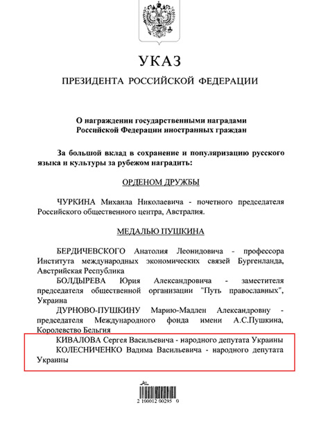 Президент России Владимир Путин наградил медалью Пушкина Сергея Кивалова и Вадима Колесниченко.