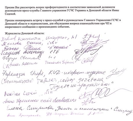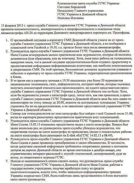 Подписанты подчеркивают, что 13 февраля 2013 года пресс-служба Главного управления ГСЧС в Донецкой области "проявила некомпетентность, неоперативность и непрофессионализм в освещении темы авиакатастрофы Ан-24 на территории Донецкого международного аэропорта им. Прокофьева".Так, о чрезвычайной ситуации в аэропорту СМИ Донецкой области узнали не от пресс-службы Главного управления ГСЧС в Донецкой области, а из сообщения в социальной сети Facebook в 19:10, когда прошло более часа после авиакатастрофы.